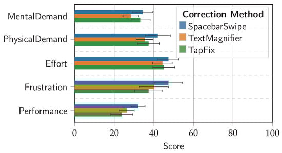 A two-way repeated-measures analysis of variance (ANOVA) was conducted to compare the effect of the correction method and type on the task completion time. Shapiro–Wilk tests and a manual inspection of the Q–Q plot confirmed a satisfactory level of normality across all conditions. Mauchly’s sphericity test was conducted to assess the assumption of sphericity. The test indicated that the assumption of sphericity was not violated (, ).