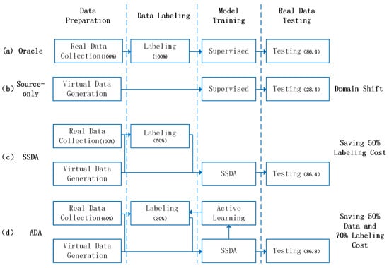 Process and performance comparison of different training strategies for detection algorithms used in autonomous driving trucks. (a) Oracle: this is the most commonly used algorithm training method, which relies solely on real data collection and labeling for supervised learning, achieving a test mAP of 86.4. (b) Source-Only: this approach depends entirely on virtual data generation without using real data and is a widely used baseline method in domain adaptation tasks, resulting in a test mAP of 28.4 due to domain bias. (c) Semi-supervised domain adaptation (SSDA): this is the method proposed in this study. It combines 100% real data collection with 50% labeling alongside virtual data generation, reducing labeling costs and achieving a test mAP of 86.4. (d) Active domain adaptive (ADA): this extended method, proposed in this study, reduces both data collection and labeling costs by 50% and 70%, respectively, using 50% real data collection, 30% labeling, virtual data generation, and active learning, achieving a test mAP of 86.8.