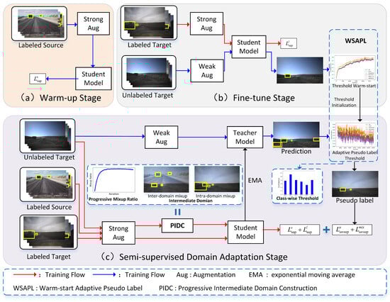 The overall architecture of the proposed Adamix framework, which consists of three training stages: (a) warm-up—the student model is trained on labeled source domain data to initialize feature learning; (b) fine-tuning—the student model is fine-tuned using labeled target domain data, while weakly augmented unlabeled data are used to initialize pseudo-labeling thresholds in the WSAPL module; (c) semi-supervised domain adaptation—the teacher model generates pseudo-labels for weakly augmented unlabeled data, and the WSAPL module adaptively updates these thresholds during training. In this stage, source data, labeled target data, and unlabeled target data are all used, with the PIDC module progressively constructing intermediate domains to improve training and mitigate domain bias.