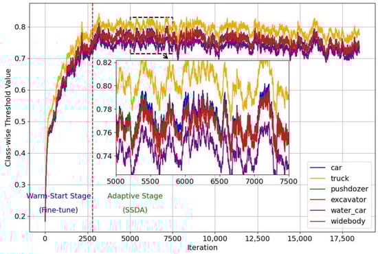 At the beginning of the SSDA phase, to provide reliable initial values for adaptive threshold adjustment, we initialize the global average confidence values using those computed during the final iteration of the fine-tuning phase. Specifically, for each category c, we set the initial global average confidence of the category c to the value calculated at the last iteration () of the fine-tuning phase. Similarly, we set the initial all-class global average confidence to the value , which was computed during the same iteration. These initializations are formalized as follows: