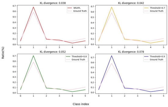 In addition to optimizing mixup strategies, we also compared our WSAPL strategy with three fixed-threshold methods (thresholds of 0.7, 0.8, and 0.9), and adaptive methods such as APL [29] and Freematch [30]. The results in Table 7 show that the WSAPL strategy achieved the highest mAP of 71.6, outperforming all of the methods compared. Of the fixed thresholds, 0.8 produced the best results, with an mAP of 71.1, while the other fixed thresholds resulted in an underperformance. WSAPL not only outperformed APL’s 70.5 but also significantly outperformed Freematch’s 68.9. Furthermore, in Figure 5, we compared the pseudo-label category distributions generated using the APL strategy and those from the three different fixed-threshold strategies against the true category distributions of the unlabeled target domain. By calculating the KL divergence among these distributions, we found that our APL strategy resulted in the smallest KL divergence, indicating that the pseudo-labels generated by our strategy most closely resemble the true distribution. These findings underscore the significant advantages of WSAPL in optimizing object detection performance, effectively adapting to varying data distributions, and addressing learning challenges across different categories.