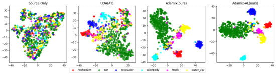 We used t-SNE [39] to visualize the feature distributions of different methods in the target domain, as shown in Figure 6. In general, the Adamix-AL method (ours) performs optimally in terms of feature separation and its clustering effect, which is significantly better than that of the other methods.