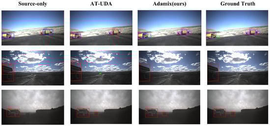 Specifically, both the Source-Only and AT-UDA methods struggle with missing and falsely detecting objects. For instance, in the third and fifth rows of Figure 7, the Source-Only method misses distant trucks, especially in dusty and overexposed weather conditions. The AT-UDA method often misdetects the sky or ground shadows as other targets, although with fewer misses. In contrast, our proposed Adamix method significantly reduces both miss and false detection rates.