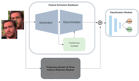 In the feature extraction backbone, we improve the internal framework based on GAN and add transformer blocks, as shown in Figure 2, to capture the complex spatial, texture, and contextual features in the fake images.
