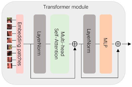 Due to the pattern specificity of GAN, it lacks a certain generalization ability for forged image detection. Here, we add a transformer module, and use the original framework’s transformer module, as shown in Figure 3. This module includes an MLP layer, a multi-head self-attention layer, a layer-norm layer, etc., which divides the forged face image into 8 patches. Each patch can be regarded as a language “word” similar to NLP (natural language processing). The multi-head attention feature extracts the information in each patch, obtains the global feature information through multi-layer calculation, and determines the forged feature part. Use the self-attention mechanism to improve the global perception of forged features. Improving detection of non-GAN forged images via fusion. The transformer block focuses on capturing global long-range dependencies. It is connected in parallel with the discriminator to provide additional global features ftrans. Combining the global neural network, local neural network, and transformer blocks, the discriminator’s feature fusion is as follows: