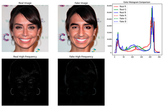 At this stage, the depth of the forged face image has solved the problems of abnormal generation of facial features, blurred face after forged modification, insufficient feature fusion, tearing, light tearing, picture granularity, etc., which existed in the previous forged image. Although the problem of deception of human vision has been solved, some hidden traces of forged operations can still be found under high-performance computer computation. As shown in Figure 5, the curves of the fake image and the real image almost completely overlap in the comparison of the image color histograms, but the blurring of the operative part of the fake face can still be easily detected in the computed image high noise comparison graph.