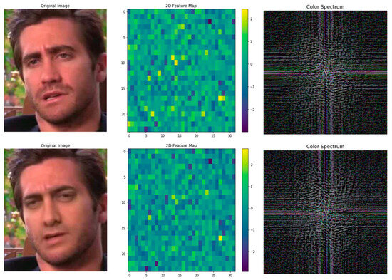 Based on the celeb-DF dataset, we extract the corresponding face images from the video and use the frequency domain features and 2D feature comparison experiments. We can still find some feature differences, as shown in Figure 6.