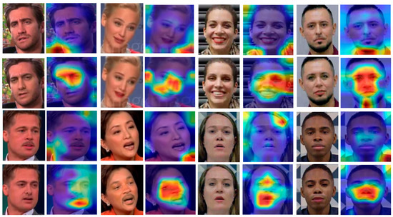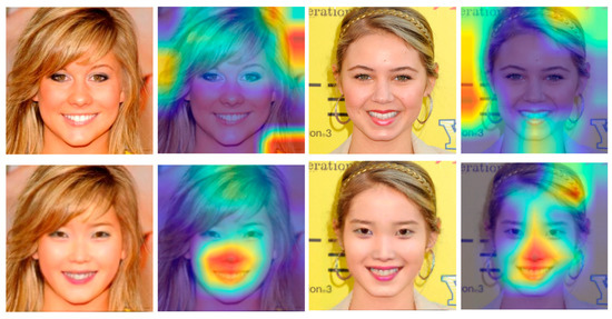 To further understand the details of the internal operation of the proposed model detection, the Grad-CAM [39] visualization tool is used here to visualize our model detection process. We used the data of the face-swapping model [40] from our previous study for the visualization of fake face detection, as shown in Figure 7, facing the original image, the model did not focus on specific features due to the absence of the fake operation feature region, but when facing the fake face image, the facial operation part was accurately detected by our model and the feature region was focused.