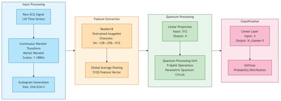 The proposed quantum transfer learning architecture implements a novel hybrid quantum–classical approach for analyzing electrocardiogram (ECG) Continuous Wavelet Transform (CWT) images as shown in Figure 2. This architecture leverages both quantum computing capabilities and classical deep learning techniques, orchestrated through a sophisticated pipeline optimized for high-performance computing infrastructure.