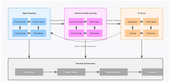 Quantum Transfer Learning. This diagram illustrates a system integrating Edge Computing, Quantum Transfer Learning, and a Federated Learning (FL) Server.
