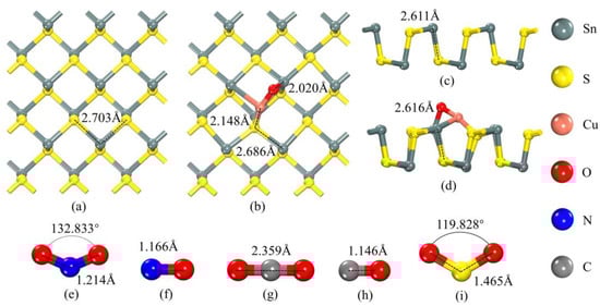 Geometric structures of pure SnS and CuO-SnS: (a–d) top and side views. Geometric structures of (e) NO2, (f) NO, (g) CO2, (h) CO, and (i) SO2 molecules.