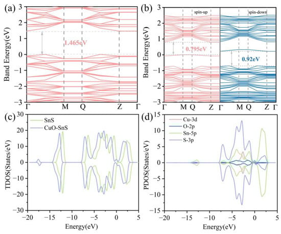 The band structures of (a) pure SnS and (b) CuO-SnS. The TDOS of (c) CuO-SnS and PDOS of (d) CuO-SnS.