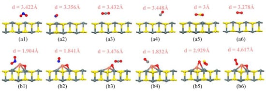 The most stable structure of the system after gas adsorption: (a1) NO2, (a2) NO, (a3) CO2, (a4) CO, (a5) SO2, and (a6) O2 adsorbed on pure SnS; (b1) NO2, (b2) NO, (b3) CO2, (b4) CO, (b5) SO2, and (b6) O2 adsorbed on CuO-SnS.