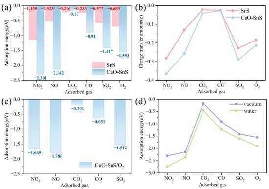 As illustrated in Figure 4a, CuO modification substantially improved the adsorption energies of most gases on SnS, except for CO2. Specifically, the adsorption energies of NO2 and NO increased to −2.3 eV and −2.142 eV, respectively, which were approximately 2-fold and 4-fold higher than those of pristine SnS. This enhancement is attributed to the reconstructed surface electronic structure induced by CuO incorporation. Further analysis of electron transfer, shown in Figure 4b, revealed a notable increase in charge redistribution during gas adsorption, particularly for NO2 and NO, confirming that CuO doping effectively optimizes the gas adsorption performance of SnS by strengthening interactions at active sites. Under simulated practical conditions, the introduction of O2 resulted in a reduction in adsorption energies for all gases on CuO-SnS, as shown in Figure 4c. However, key characteristics such as the selectivity and adsorption energy remained stable. Additionally, humidity significantly enhanced the adsorption energies in aqueous environments, as depicted in Figure 4d, which indicates the promoting effect of humidity on the adsorption kinetics of the CuO-SnS surface.