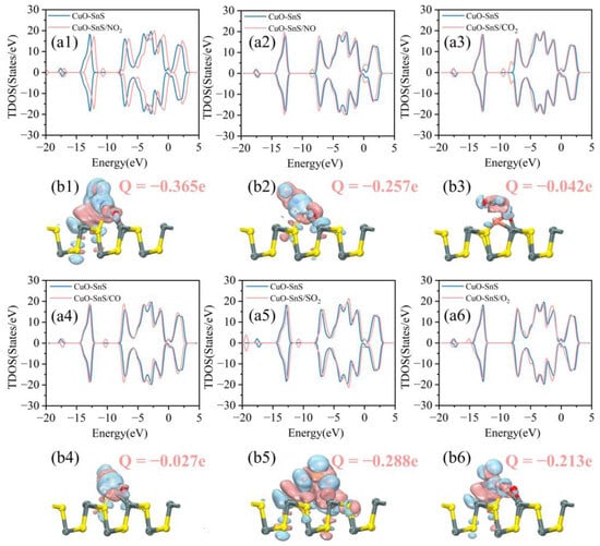 The TDOS of the system after gas adsorption by CuO-SnS: (a1) NO2 system, (a2) NO system, (a3) CO2 system, (a4) CO system, (a5) SO2 system, (a6) O2 system. The DCD of the system after gas adsorption by CuO-SnS: (b1) NO2 system, (b2) NO system, (b3) CO2 system, (b4) CO system, (b5) SO2 system, (b6) O2 system.