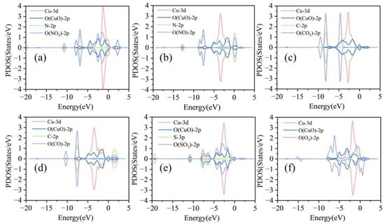 The PTDOS of the system after gas adsorption by CuO-SnS: (a) NO2 system, (b) NO system, (c) CO2 system, (d) CO system, (e) SO2 system, (f) O2 system.