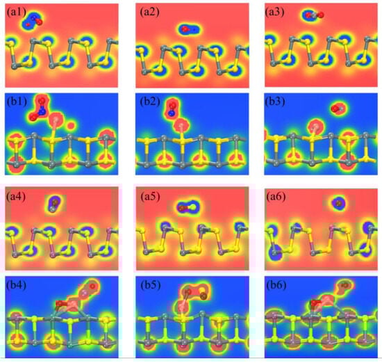 The ELF of the system after gas adsorption: (a1) NO2, (a2) NO, (a3) CO2, (a4) CO, (a5) SO2, and (a6) O2 adsorbed on pure SnS; (b1) NO2, (b2) NO, (b3) CO2, (b4) CO, (b5) SO2, and (b6) O2 adsorbed on CuO-SnS.