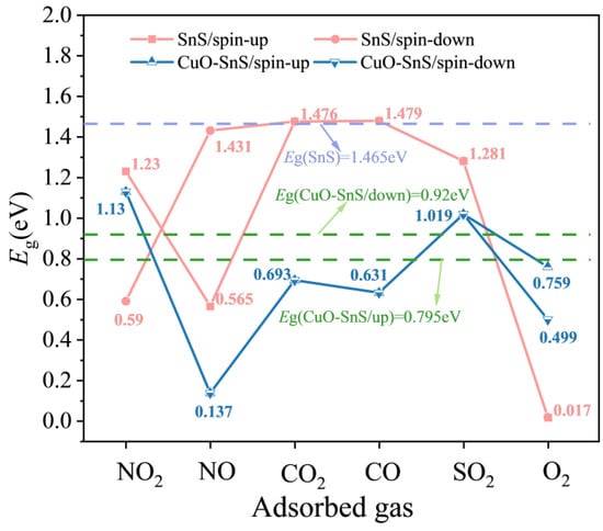 To elucidate the regulatory mechanism of CuO modification in the electronic transport properties of SnS, this study systematically analyzes the band gap variations before and after gas adsorption and their structure–conductivity relationships, as shown in Figure 8. In the pristine SnS system, the adsorption of NO and NO2 induces significant spin polarization, leading to band splitting into two spin channels. Among them, the spin-down channel exhibits the most pronounced band gap reduction, which is closely associated with the enhancement of its magnetic moment and the redistribution of charge.