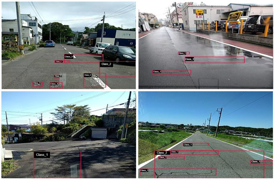 The following details the three existing challenges and their impacts: as shown in Figure 1, there are four categories (class_0, class_1, class_2, class_3), which, respectively, represent longitudinal cracks, transverse cracks, alligator cracks, and potholes. These challenges include small object detection, complex background interference, and the damage of irregular shapes. Small object detection is particularly challenging in road damage recognition, especially for fine cracks. Due to their small size, crack features are often not prominent in images, especially in high-resolution images, where the edges of cracks may be difficult to distinguish due to blurring or noise. The low contrast between small cracks and the surrounding road surface further increases the difficulty for the model, leading to false positives or missed detections. Additionally, because small damage occupies a small percentage of the pixels, it can be overlooked during global feature extraction, which is a problem that is exacerbated in low-resolution or noisy images [18]. Complex background interference is another significant challenge in road damage detection. Common environmental factors, such as changes in lighting angles, tire tracks, and water coverage, often resemble or interfere with damage patterns, making them difficult to accurately identify. This background noise causes the model to misclassify the background as a damage site or ignore actual damage, thereby affecting detection accuracy. Furthermore, background interference increases the difficulty of feature extraction, further lowering the reliability and efficiency of the detection system [19]. Irregular damage shapes pose an additional challenge for feature extraction. Cracks are influenced by various factors during formation, resulting in discontinuous, branching, or mesh-like structures. These irregular shapes make it difficult for the model to extract consistent features, as feature information may be blurred or lost, especially during the deeper stages of feature extraction. The complexity of damage shapes further exacerbates the difficulty of model in capturing fine details, impacting the accuracy and robustness of detection [20].