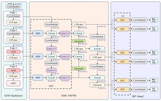 (2) To improve detection of small-scale damage, such as fine cracks, we introduce the SOM. This module enhances the representation of small object features by utilizing high-dimensional feature projections.