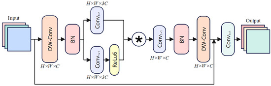 where represents the input feature map. represents the fused feature map, which is obtained by applying depthwise convolutions and pointwise convolutions, followed by element-wise multiplication and ReLU activation. This map enhances the spatial and semantic representation of small-scale features. is the intermediate feature map after further refinement using depthwise convolution and residual addition with the original input features. Assume the input feature has dimensions , where H and W denote the spatial dimensions and C is the number of channels. The input feature undergoes a series of transformations to enhance its representation while preserving spatial and semantic details. Firstly, the input feature map is processed by a Depthwise Convolution (DWConv1) to extract spatial features independently for each channel. The resulting feature map retains the same spatial dimensions and channel count C. Next, Batch Normalization (BN) is applied to stabilize the mean and variance of the feature map, ensuring consistent training. The normalized feature map dimensions remain . Following normalization, the feature map is divided into two branches. The first branch applies a Pointwise Convolution (), adjusting the channel count to . The second branch undergoes the same transformation, followed by a ReLU6 activation to introduce nonlinearity by clamping values to the range . The outputs of both branches are fused via element-wise multiplication (⊙), producing the enhanced feature map with dimensions . Subsequently, the fused feature map passes through another Pointwise Convolution (), reducing the channel count back to C. This is followed by a Depthwise Convolution (DWConv2), which refines spatial features. The resulting feature map retains dimensions . To preserve the original spatial and semantic information, a residual connection adds to . Finally, the enhanced feature map is refined through a last Pointwise Convolution (), adjusting the channel dimensions to . This produces the final output feature map with dimensions .