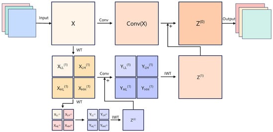 where i represents the decomposition level. This process progressively increases the receptive field while retaining the spatial resolution of features. After convolutional operations are applied at each level, the outputs are recombined through the inverse wavelet transform (IWT):