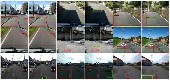 The red boxes in Figure 7 represent road damage that can be detected by the YOLOv8 model, and the green boxes represent road damage that cannot be detected by YOLOv8 but can be detected by YOLO-RD. Note that the road damage marked by the red box can also be detected by YOLO-RD.