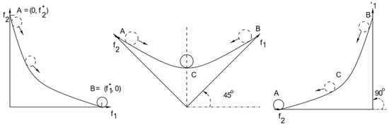 Figure 1 shows that when rotating a convex graph, all of the Pareto Solutions are a stable minimum for a specific rotation, which means that different solutions will be chosen for different sets of weights. However, Figure 2 shows that when the shape of the graph is concave there is no stable minimum, despite the rotation, so the solution chosen is always one of the two extreme points. This proves that minimization based on weights is not suitable for concave graphs [20]. Based on a similar logic, it can be concluded that the maximization problem based on weights cannot be implemented in a convex graph. This explains the issue described earlier and in more detail in ref. [11], where the convex part of the Pareto Front is left unexplored by the decision-making algorithms. Therefore, in this paper, we propose transforming the Pareto Front with a transformation that changes its shape into a concave graph before implementing the decision-making algorithms.