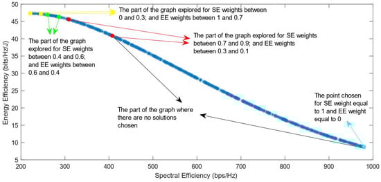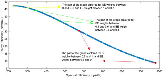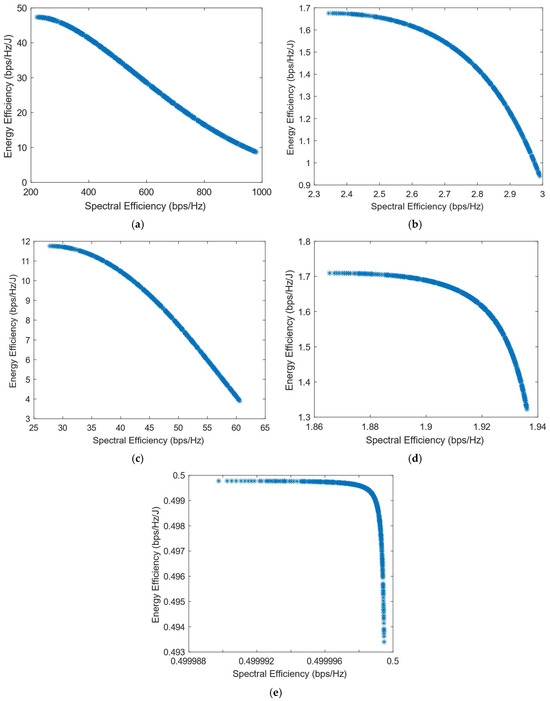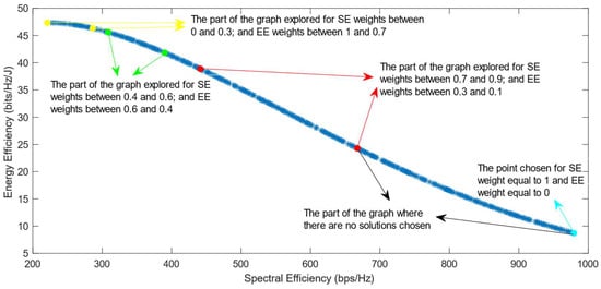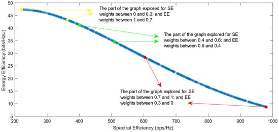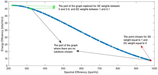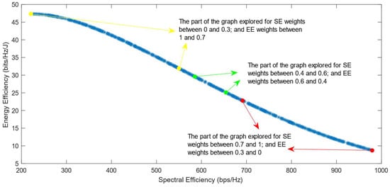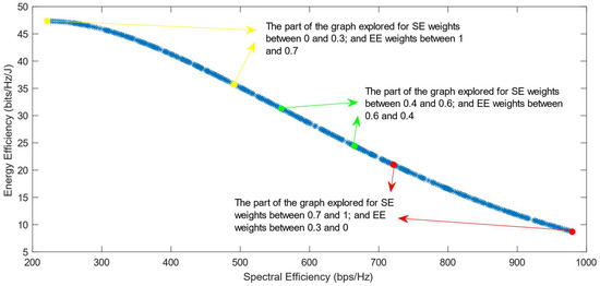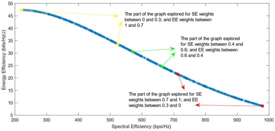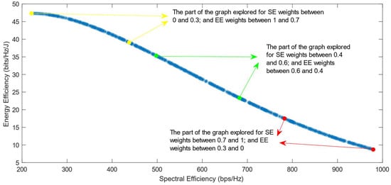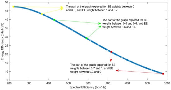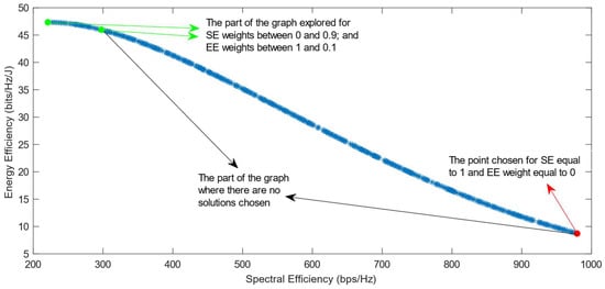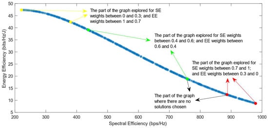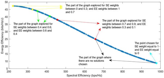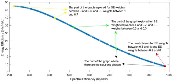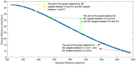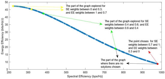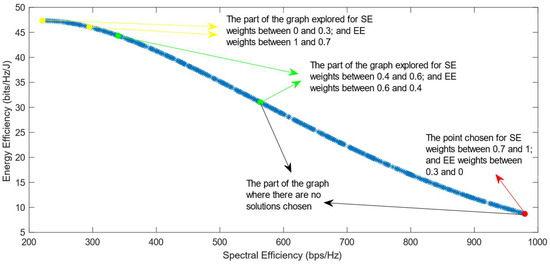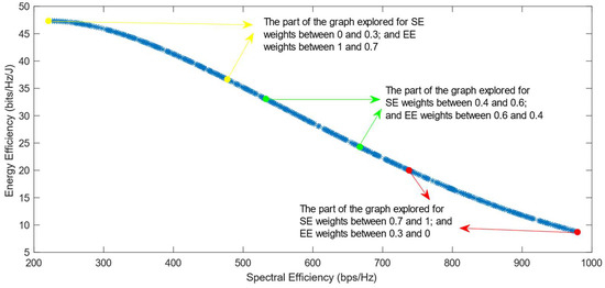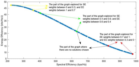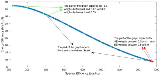 Much previous research has been conducted on this problem, mainly focusing on using different evolutionary multi-objective optimization algorithms to solve it [5]. The optimization algorithms generate a Pareto Optimal Front, comprised of non-dominated solutions, which means that none of the points in the Pareto Front (PF) is better than another regarding both optimization objectives [6]. Also, it has been proven that different optimization algorithms have similar results, so they generate Pareto Fronts close to the ideal one when they are used with a high number of generations and a high number of individuals per generation [6,7]. Previous work focused on each efficiency separately has shown that the maximization of energy efficiency is a non-convex issue, which means that it achieves a maximum value and then begins to decrease with further increase in the values of the variables [8]. This non-convex optimization issue is more complicated, and it requires special methods to be solved, such as the ones proposed in refs. [9,10]. Taking into consideration this fact, the multi-objective optimization problem regarding the trade-off between two efficiencies is also a non-convex problem. This is confirmed by the shape of the Pareto Front generated by the multi-objective optimization algorithms. However, there is a lack of research focused on choosing one of the solutions in the generated Pareto Front. In ref. [11], different Multi-Criteria Decision-Making (MCDM) algorithms have been implemented and compared in order to find the best one for choosing only one of the solutions after the optimization process. However, ref. [11] highlighted an issue with all of the MCDM algorithms, which was that when the weight of the spectral efficiency was even slightly higher than that of the energy efficiency, the algorithms almost always chose the solution with the highest value of SE possible.
