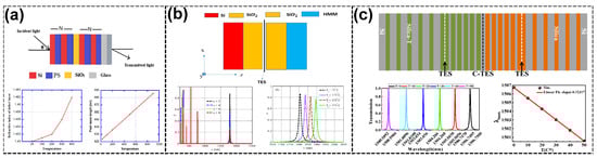 Additionally, Bouazzi et al. [109] proposed a novel approach combining 1D TPCs with nematic liquid crystals (NLCs) to achieve dynamic thermo-optic modulation. By leveraging the RI tunability of NLCs under temperature variations, coupled TES modes exhibited exceptional sensitivity and high-Q resonances. Two configurations were explored: the complete replacement of silica layers with NLCs and localized substitution within specific PC regions. These configurations demonstrated sensitivities of up to 0.12317 nm/°C, with a remarkable FOM exceeding 1002.48 °C−1, suitable for precise temperature sensing in harsh environments (see Figure 3c).