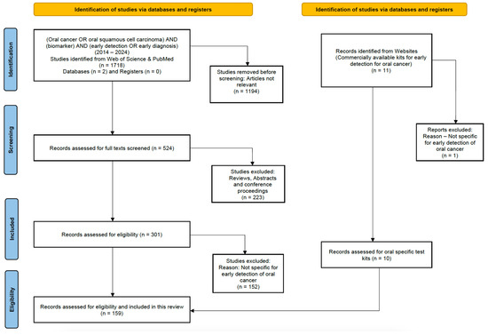 The Preferred Reporting Items for Systematic Reviews and Meta-Analyses (PRISMA) flow diagram was used to report the studies involved in this non-meta literature review (Figure 3). A comprehensive search was conducted using keywords on PUBMED, Web of Science, and individual websites using the Google search engine. The keywords used were (“oral cancer” OR “oral squamous cell carcinoma”) AND (“biomarker”) AND (“early detection” OR “early diagnosis”). The studies were searched from 2014 to 2024 and we excluded citations, conference proceedings, abstracts, and any systematic reviews. An additional search was conducted to analyze any commercially available kits for the early detection of oral cancer. The search also focused on studies specifically targeting the early detection or diagnosis of oral cancer biomarkers, with an additional searching criterion of electrochemical biosensors for early biomarker detection. This included the three main electrochemical methods reported in this review (amperometric, voltammetric, and impedimetric). The original research articles included were in the English language, and research papers published before 2014, book chapters, and those in other languages were excluded from this review. To illustrate the usability of this framework, the biomarkers specific to oral cancer were identified, their current molecular detection strategies were studied, and the need for electrochemical biosensors was analyzed. An overview of such biosensors was created, with their fabrication, the strategies involved, and the need for early detection biomarkers associated with oral cancer, as well as their limits of detection (LODs).