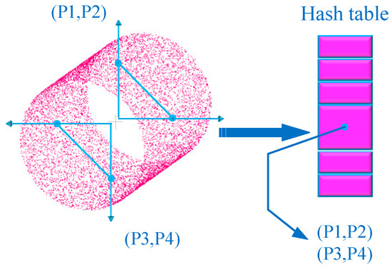 In the offline global training phase, the algorithm first calculates a four-dimensional feature vector for each pair of points in the model point cloud. This vector includes the distance between the two points, the angle between their normal vectors, and the angles between each point’s normal vector and the line connecting the two points. These feature vectors not only describe the local geometric structure of the point cloud but also exhibit invariance to the object’s rotation and translation. Subsequently, these vectors are stored on a hash table, as illustrated in Figure 2.