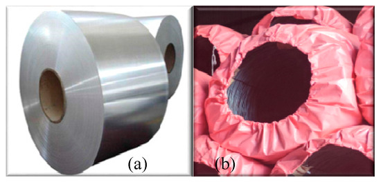 Comparison of appearance between steel rolls and coil workpieces: (a) steel roll and (b) coil workpiece.