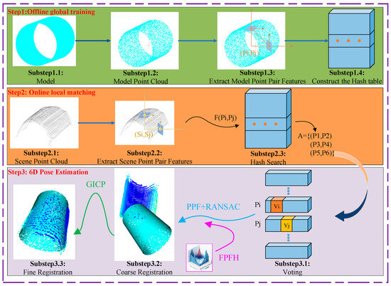 The overall algorithm flow for the point cloud pose estimation of coil workpieces in the storage area, as implemented in this paper, is shown in Figure 4. This section is divided into three parts: offline global training, online local matching, and 6D pose estimation. Offline global training includes four components: (1) object modeling to create a 3D representation of the target object; (2) model point cloud construction to generate a sampled point cloud of the object model; (3) model point pair feature extraction to compute point pair features (PPFs) for all pairs in the model point cloud; and (4) hash table construction: discretize PPFs and build a hash table for efficient feature indexing. Online local matching includes three steps: scene point cloud acquisition: (1) capture or generate the scene point cloud; scene point pair feature extraction: (2) compute PPFs for sampled point pairs in the scene; and (3) hash search: for each scene point pair feature, search for similar model point pairs in the hash table (utilizing the hash table built in Substep 1.4). 6D pose estimation consists of three stages: (1) voting mechanism: vote for candidate poses by aggregating transformations from matched point pairs (obtained in Substep 2.3); (2) pose clustering and coarse filtering: cluster similar candidate poses and remove redundancies; (3) ICP refinement: use the top candidate poses from PPFs as initial transformations for the ICP. Then, the pose alignment is iteratively optimized. The pose with the minimal error is selected as the final estimation result.
