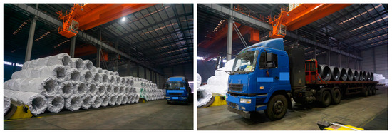 In industrial automation, particularly in tasks such as the pose estimation and grabbing of coil workpieces in warehouses, as discussed in this paper, the main challenges arise from the unique shapes of workpieces and environmental factors, such as coils and steel rolls. As shown in Figure 3, unlike the steel coils discussed in the articles by Lim T G [36] and Liu et al. [37], which have relatively smooth surfaces, where each coil is supported on a fixed saddle without stacking, the surface of coil workpieces in the actual storage areas is not as smooth. Additionally, unlike other smooth or regularly shaped workpieces that can be identified and located through simple reflective features and edge detection, coil workpieces require a more complex processing sequence. This complexity is due to the texture that forms on the surface of the workpieces after the steel wire is coiled, which is not smooth, and their shapes may undergo slight deformations due to stacking during the production stages and transportation methods. Therefore, the surface texture and irregular deformations of coil workpieces may lead to errors in feature matching and model alignment in traditional algorithms.