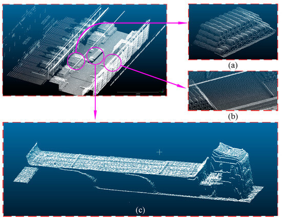 After scanning the entire storage area of coil workpieces with LiDAR (Light Detection and Ranging), a complete point cloud of the warehouse scene was obtained. This included scenes of stacked coils on the ground and on trucks, as shown in Figure 7 below. The left image shows the entire scene point cloud of the storage area. We used CloudCompare to segment the scene point cloud, and the right image (a) displays ground point cloud stacks, including both the bare ground and areas where the coils are stacked. Image (b) shows the point cloud stacks on the truck within the scene, and image (c) depicts the point cloud of the truck in the scene.
