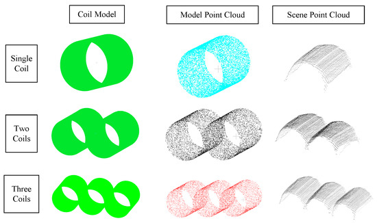 After acquiring the scene point clouds, the next step is to process the point clouds through a series of operations. Common point cloud processing algorithms include filtering, segmentation, and fitting, which can be implemented using point cloud processing libraries such as PCL [5] or Open3D [6], depending on the programming language or the complexity of the task. Additionally, the CloudCompare software (version 2.13.2) [7] can be used more conveniently for the preprocessing of point clouds. For example, pass-through filtering [8] can be used to remove parts of the scene outside the target point cloud; statistical filtering or radius filtering can be used to remove noise from the point clouds, enhancing the accuracy of subsequent pose estimation; voxel filtering [9] can replace other points within a voxel with the center point of the voxel block, reducing the amount of point cloud data and increasing the speed of subsequent processing. To address different usage scenarios, researchers have improved existing point cloud processing algorithms [10,11], enhancing processing accuracy and better preserving the information of the target point cloud. In the point cloud preprocessing phase of this paper, pass-through filtering [8] combined with CloudCompare was used to filter out ground point cloud information, retaining more characteristic coil-related point clouds and ensuring the accuracy of subsequent pose estimation.