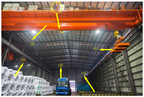 Storage area grabbing equipment diagram (a) LIDAR; (b) overhead; (c) coil stacking; (d) truck; (e) saddle; and (f) crane electromagnet.