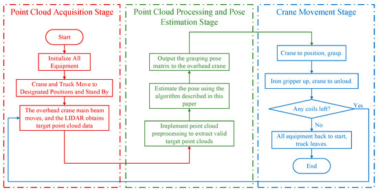 An entire operational workflow in the storage area primarily includes two directions: unloading coils from a fully loaded truck and loading coils onto an empty truck, using the overhead crane to transfer coils between the truck and designated spots on the warehouse floor. The equipment control processes for both directions are similar and include three main stages: (1) the point cloud collection stage, where all equipment is initialized, and the crane’s main beam is moved to align with the line scanner to collect point cloud data; (2) the point cloud processing and pose estimation stage, where point clouds are processed using software and algorithms to extract and handle the target coils for grabbing, and the pose estimation results are sent to the crane; and (3) the crane movement stage, where the crane executes the loading and unloading tasks based on predefined strategies and the pose information, also checking for any remaining coils. This workflow, illustrated in Figure 10, continues in a cycle until all the coils in the target stack are fully loaded or unloaded.