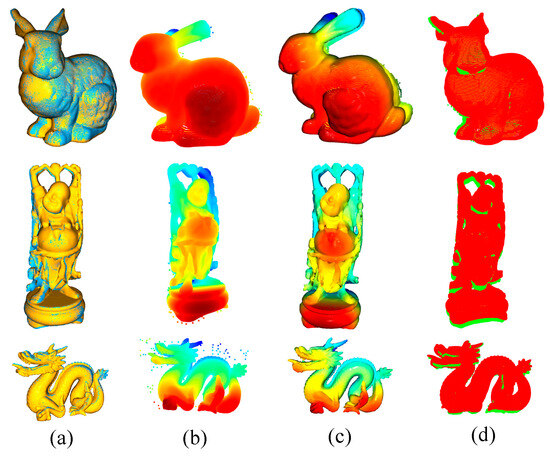 When performing pose estimation for coil workpieces, this study first compared the improved algorithm presented in this paper with three commonly used pose estimation algorithms using a public dataset. The algorithms compared included PCA (Principal Component Analysis) [42] coarse registration combined with ICP (Iterative Closest Point) fine registration from the Open3D point cloud processing library, the FPFH (Fast Point Feature Histogram) [21] algorithm, and the Fast-PPF [39] algorithm. The comparisons utilized several datasets from the Stanford 3D Scanning Repository [43]. The experiments with our algorithm and the comparative algorithms are illustrated in Figure 11.