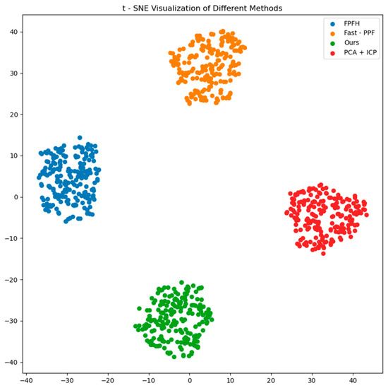 Figure 12 presents a t-SNE-based dimensionality reduction visualization, comparing the feature representation capabilities of four methods: FPFH, Fast-PPF, our algorithm, and PCA + ICP. t-SNE maps high-dimensional features into a two-dimensional space while preserving local neighborhood relationships. In the figure, each method forms a distinct and tightly clustered group, indicating that the extracted features have strong discriminative properties.
