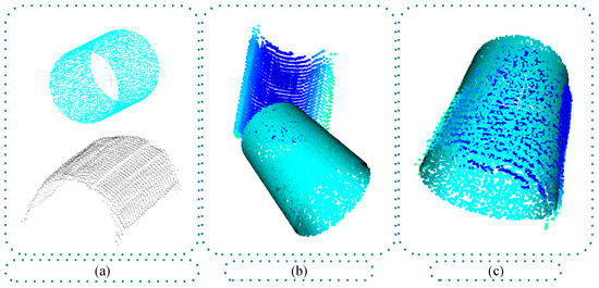 Storage area coil: (a) model and scene point cloud diagram; (b) coarse registration diagram; and (c) fine registration diagram.