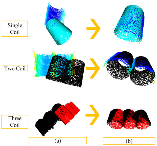 Pass-through filtering [8] is a range-based filtering technique used to crop point cloud data. It allows for the removal of environmental point clouds not belonging to the target and can also segment regularly repeated target point clouds. In the data preparation phase, pass-through filtering is one of the quickest and most convenient algorithms in traditional methods. It works by setting a well-defined range along coordinate axes, including setting thresholds on the , , and axes to filter out point clouds that are either below or above these thresholds, thereby retaining only the point clouds located at specific heights. This method effectively isolates the point clouds of stacked coil workpieces. For instance, when using the z-axis, the relevant formula is as follows (1):