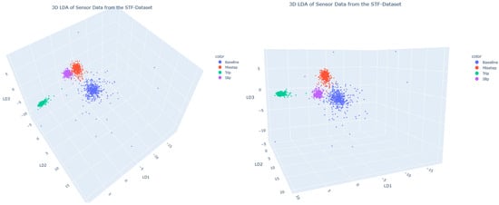 LDA of sensor data of the STF dataset. The two graphs are different perspectives of the same plot.