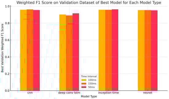 CNNs and InceptionTime demonstrated exceptional consistency over all of the window lengths, with the models achieving higher F1 scores correlating with better generalization capabilities and lower validation losses. The model achieving the highest performance in terms of weighted F1 score on the validation dataset is the InceptionTime model, which attained a validation F1 score of 0.9632 at a window size of 500 ms, potentially attributed to its architectural design and hyperparameter tuning, including a learning rate of 0.000197 and a regularization rate of 0.013995.