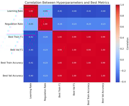 The hyperparameter correlation analysis (Figure 4) revealed that medium learning rates (0.001–0.005) and regularization rates (0.001–0.01) were associated with the best performance. Excessively high learning rates led to unstable models, while low regularization occasionally resulted in overfitting. These findings emphasize the importance of careful hyperparameter tuning to balance model stability and generalization.