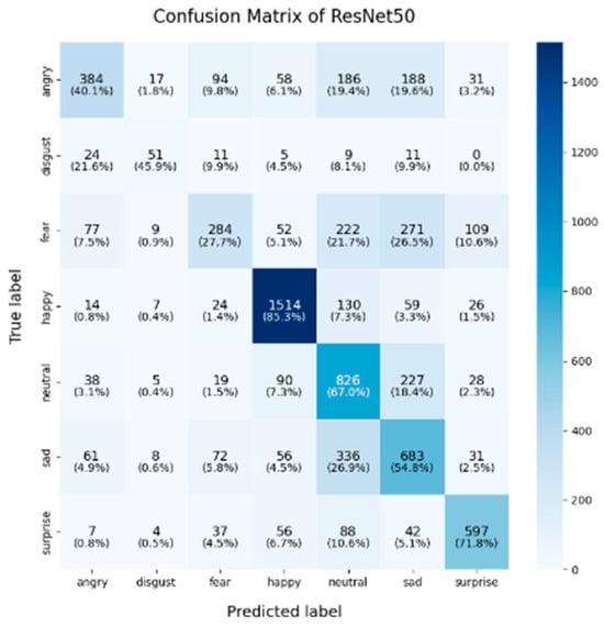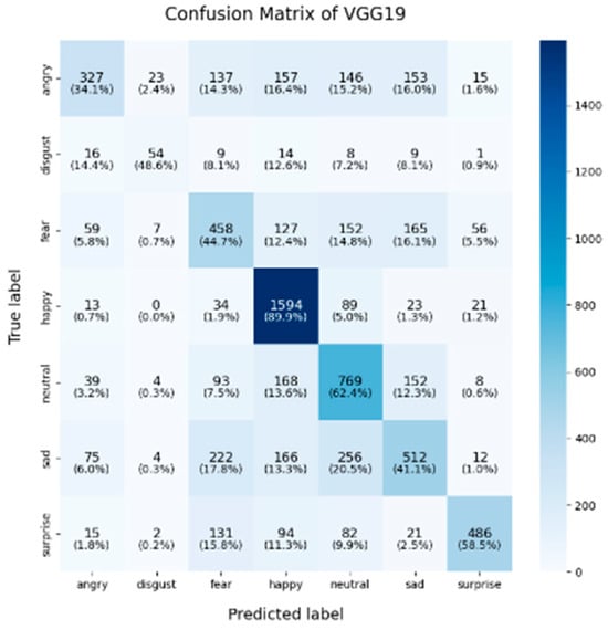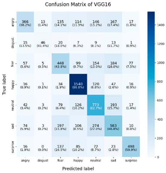 In this study, we chose to use the confusion matrix as the primary method for evaluating and comparing the performance of the models. The confusion matrix is widely regarded as a critical tool for assessing the performance of classification models, particularly in multi-class tasks like facial expression recognition (FER). It offers a comprehensive view of the model’s ability to correctly classify each category, as well as its tendency to misclassify instances into other categories [56,57].