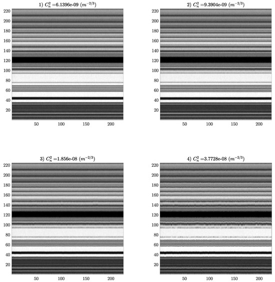 In Figure 4, we show four representative images of the turbulence range studied, in which it can be seen that the fluctuation over time (horizontal axis) increases with the intensity of the turbulence. By analyzing the evolution images, it is possible to characterize the intensity of the turbulence.