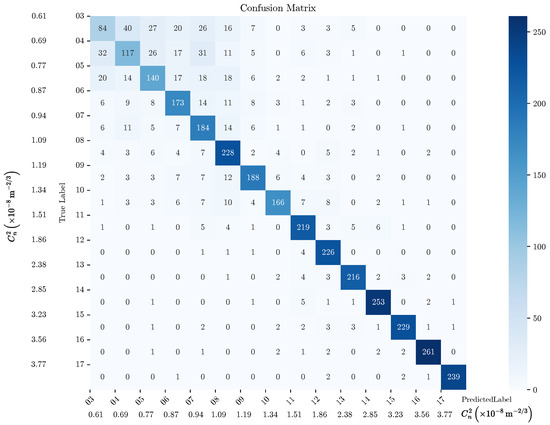 In contrast, the model exhibited relatively lower accuracy for lower turbulence intensities (lower than m−2/3), where the distinguishing features in the spatio-temporal domain were subtler and potentially more influenced by noise. This behavior shows the challenge of discerning fine-grained variations in low-intensity turbulence and suggests opportunities for further refinement in data preprocessing or feature extraction to enhance sensitivity to minor perturbations in future work.