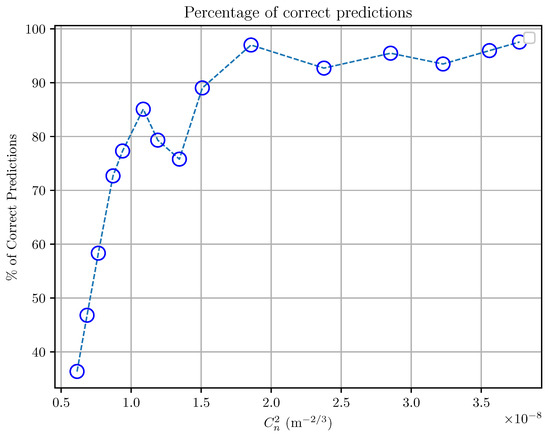 This matrix provided a detailed breakdown of the correct and incorrect predictions for each label (turbulence intensity). Focusing on the diagonal elements of the matrix, which represent the correctly classified samples, we plotted them as a percentage of correct predictions versus the intensity of the turbulence (Figure 9). This analysis revealed that for turbulence intensities () greater than or equal to m−2/3, the model achieved a success rate exceeding 90%. This suggests that the model performs very well in identifying higher turbulence intensities.
